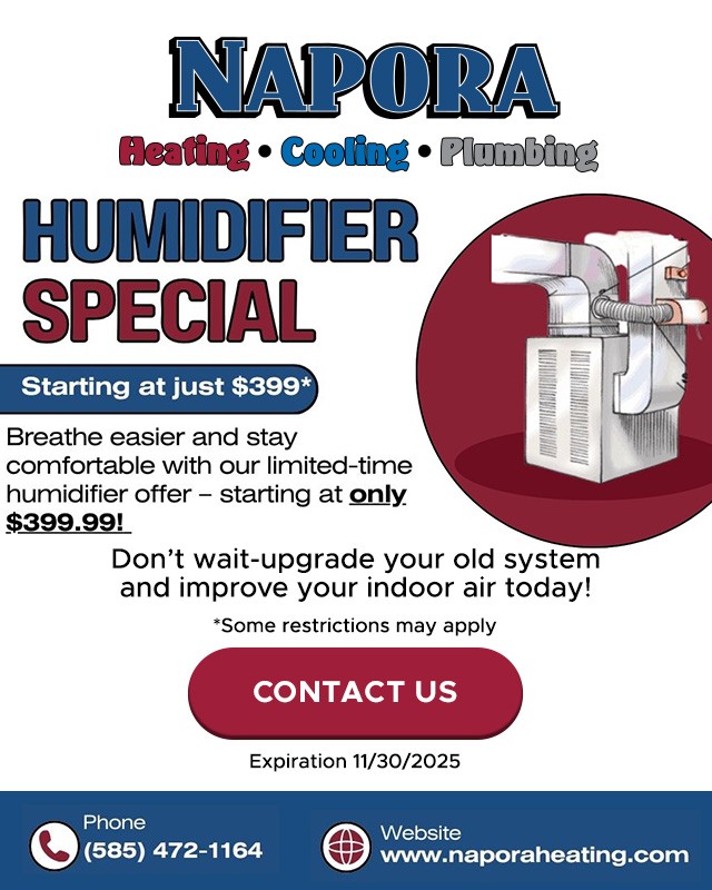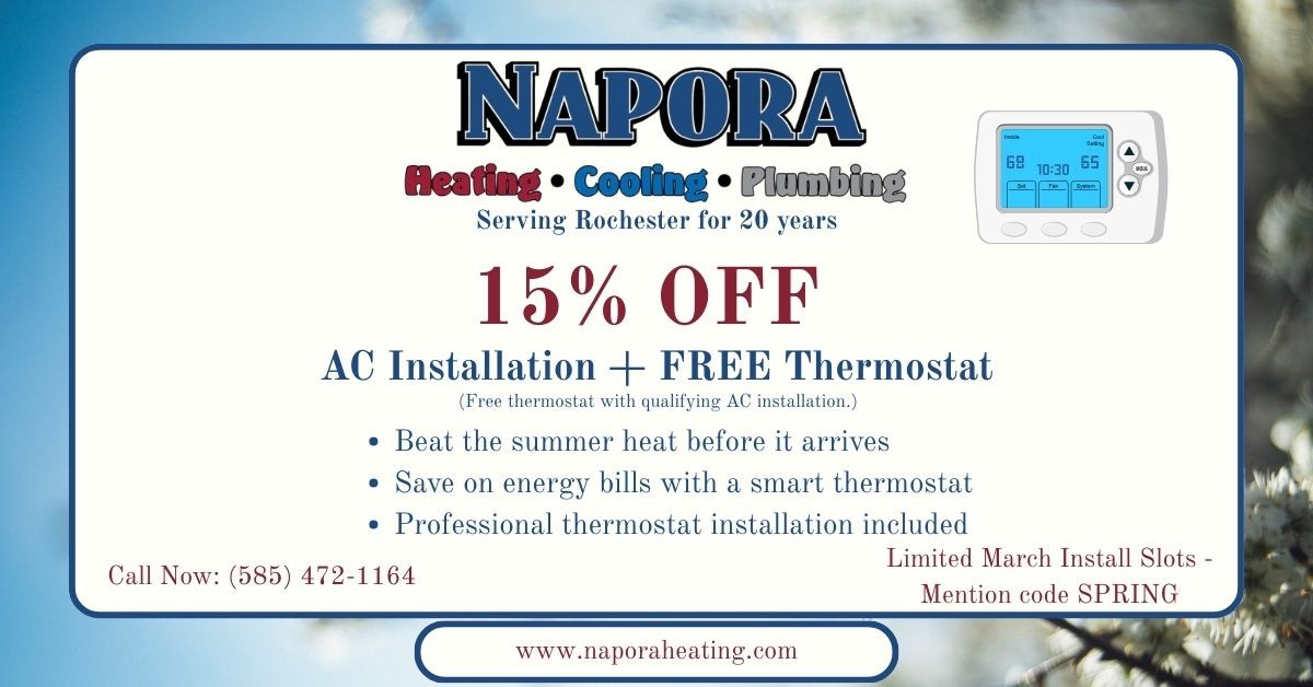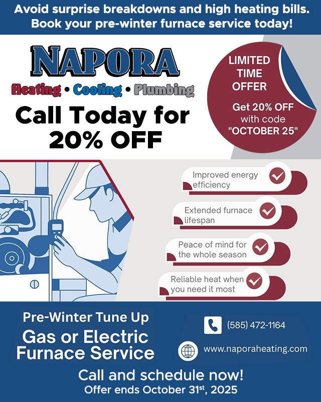 Whether you’re a homeowner, a property manager or the owner of a local business, there’s no room for compromise when it comes to your heating, cooling and plumbing needs. Napora is a family owned and operated HVAC company based in Webster NY, proudly serving the greater Rochester area.